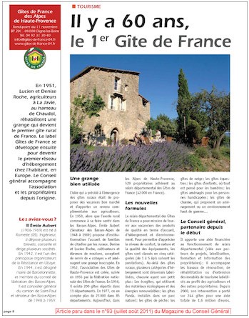 Les 60 ans du premier gîte rural puis le soixantième anniversaire de la création de la Fédération Nationale ont été l’occasion de nombreux évènements dans les Alpes de Haute-Provence. Vous pouvez consulter ci-dessus l’article paru à cette occasion dans la revue du Conseil Général 04, partenaire de la première heure des Gîtes de France dans le département.